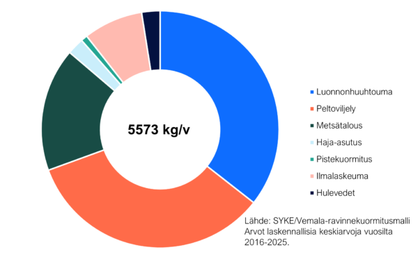 Yli puolet Maaveteen tulevasta fosforista on peräisin ihmistoiminnasta. Kolmannes fosforista on peräisin peltoviljelystä ja vajaa kolmannes on metsien luonnonhuuhtoumaa.