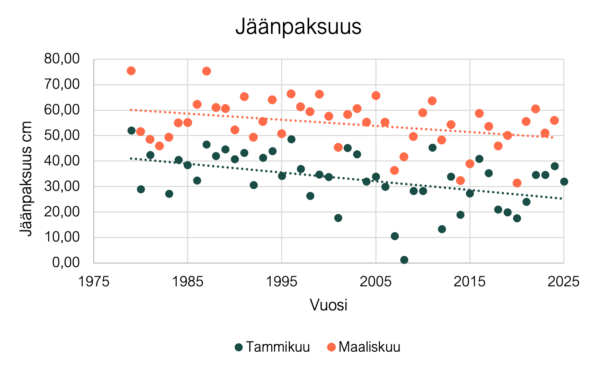 Jäätymisen tapahtuessa myöhemmin myös jää on ohentunut. Jäänpaksuutta on mitattu Itkonniemellä vuodesta 1978, minkä jälkeen jää on ohentunut tammikuussa noin 15 cm ja maaliskuussa 10 cm. Myöhäisempi jäätymispäivä selittää muutosta varsinkin tammikuussa.
