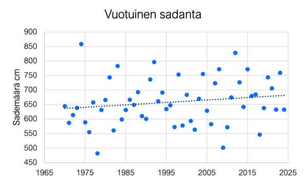 Vuotuinen sadanta Kallavesi-Konnuksen alueella 1970–2024. (Lähde: Syke/Hertta)