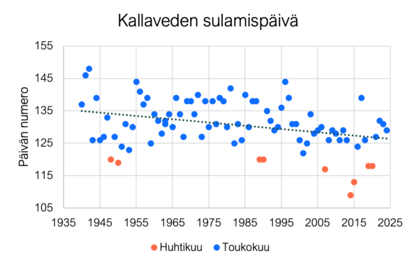 Päivä, jolloin Kallavesi on ollut kokonaan sula Itkonniemeltä katsottuna 1940–2024. Kuvaajissa päivän numero kertoo, monesko päivä vuotta päivämäärä on ollut. Jos jäätyminen on tapahtunut vasta tammikuussa, on päivän numero laskettu edellisen vuoden alusta. (Lähde: Syke/Hertta)
