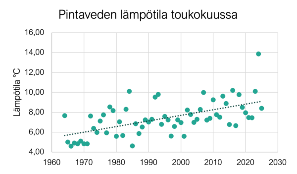 Kallaveden pintalämpötila Itkonniemeltä mitattuna vuosina 1964–2025. (Lähde: Syke/Hertta)